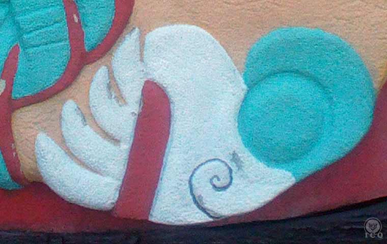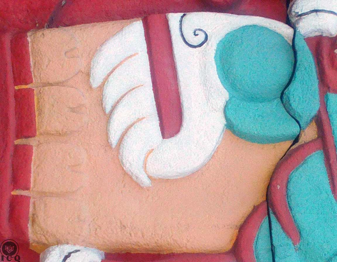 There is a skull on her waistline, similar to that of "The One with the Skirt of Serpents", goddess of Earth, of life and death. We must remember she is her daughter, yet in this instance the skull is a representation of the extinction of the positive values of the soul, as they wane until they disappear as our psychological aggregates manifest.